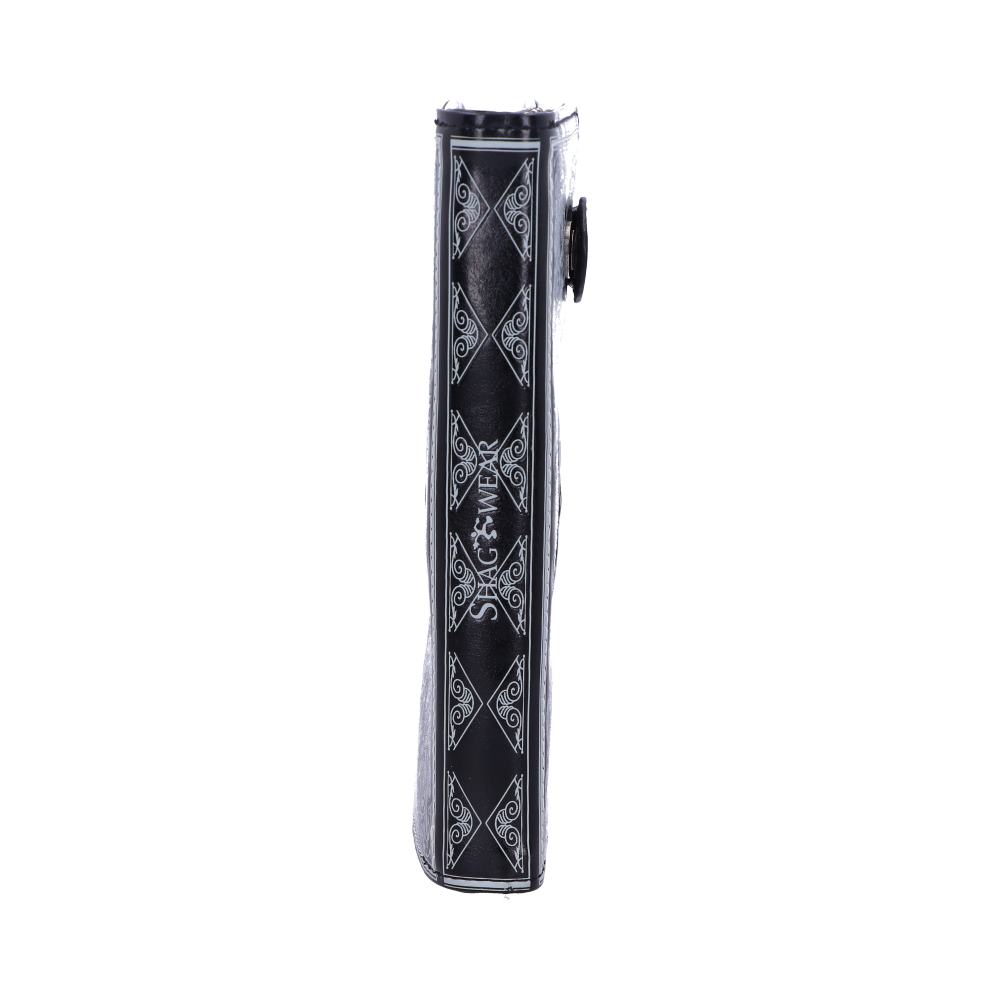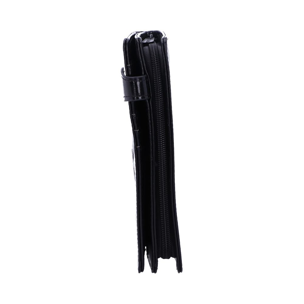 From Gothic masters Nemesis Now, this fantastic skull purse is a great way to keep your money safe. On a black background, a white skull sits in the centre of the purse, facing directly at you and grinning macabrely. It's surrounded by baroque plumes and feathers, giving the impression of a particularly ornate playing card design. Held closed by a stud button on a black strip, and with a large zip compartment, this alternative purse is small enough to fit in any handbag while being spacious enough to accommodate all your cards and cash.