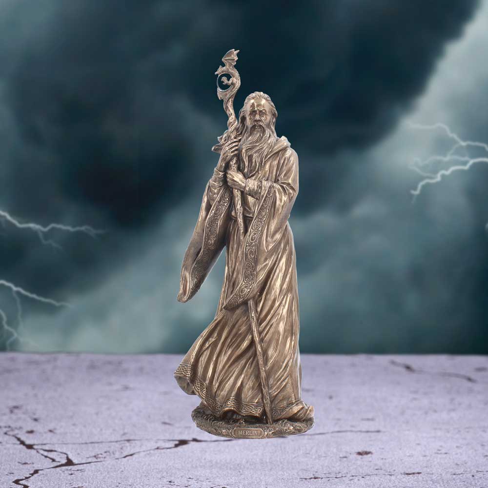 From alternative brand Nemesis Now's giftware collection, this magnificent Merlin statuette can bring magic to any home. Standing tall, the great wizard Merlin stares ahead, robes swept about him by the wind. He clutches his magical staff close, the sacred oak topped by a glass orb. Cast in high-quality resin before being given a bronze finish, this figurine makes a perfect gift for anyone who needs some magic in their life.