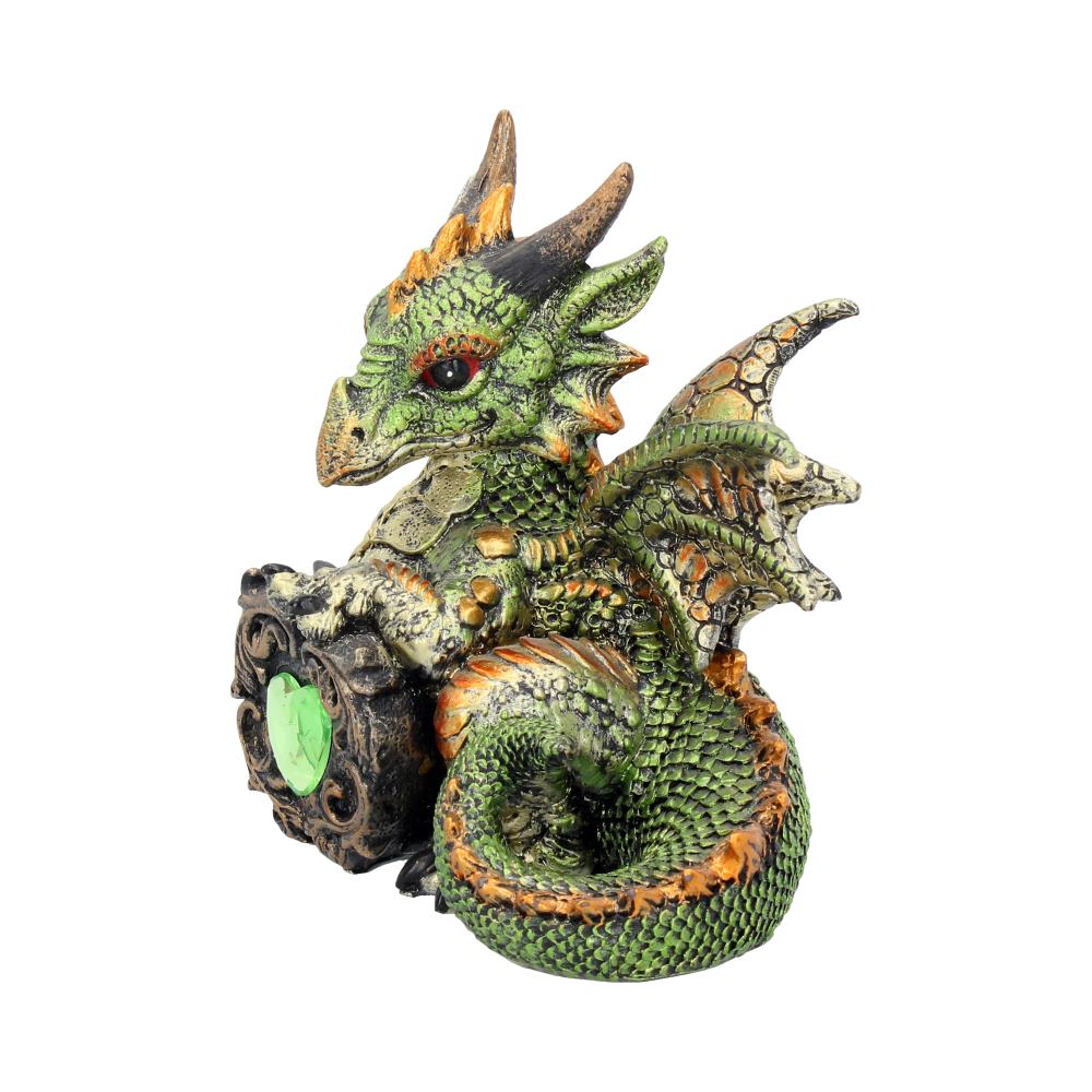 Sitting down while holding an ornate frame of dull brass, this iridescent Green and Gold Dragon looks at you curiously. The Yellow that tips the ridge along their tail is mirrored on the sides of their underbelly. The tips of their wings, talons and nose are a bright golden colour. Set in the frame is a large Emerald jewel, and the Dragon seems to be guarding it. Cast in the finest resin before being lovingly hand-painted, this Fantasy Dragon statuette is a brilliant addition to any Gothic figurine collection.