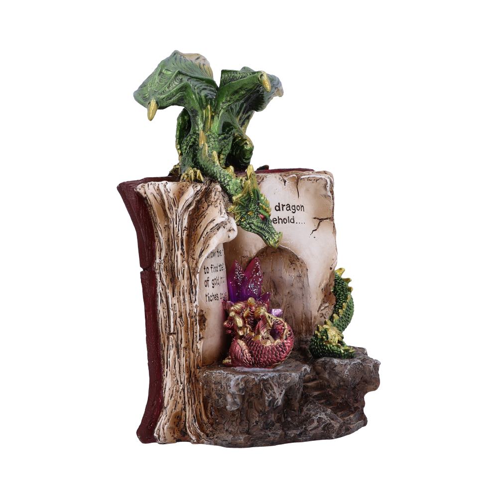 From alternative brand Nemesis Now, this large emerald Dragon sits atop the pages of an aged book. Within the pages, a staircase has been carved, and a small red dragonling sits by a large Fuschia crystal. The pages of the book read 'Follow the stairs to find treasures of gold, more riches and jewels than a dragon could behold'. These beasts are cast in the finest resin before being hand-painted and will look perfect in any dragon enthusiasts collection.